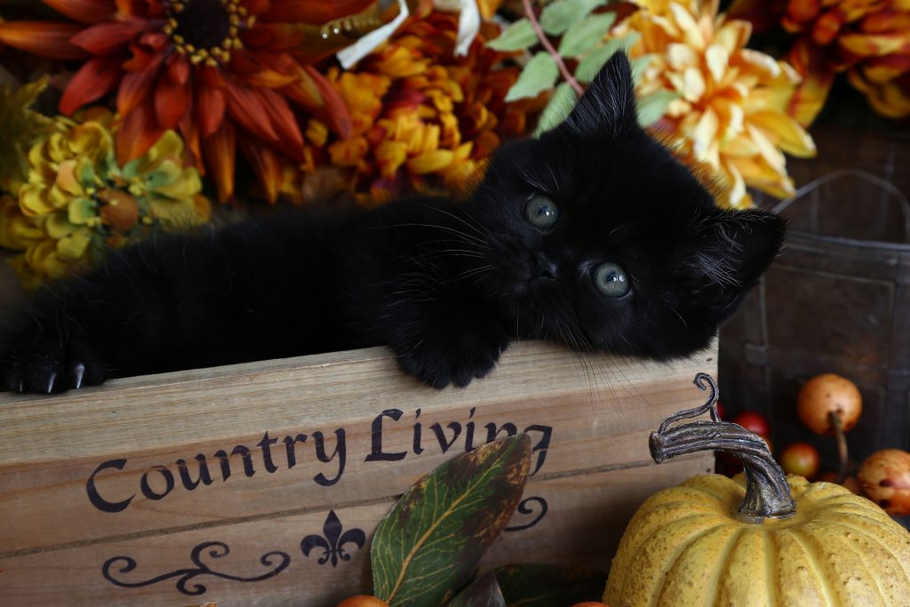 A solid black, 1 year old persian cat with brilliant copper eyes.
